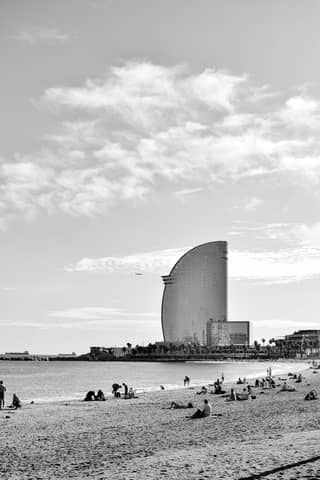 Black and white image of Barcelona beach with W Hotel and scattered people enjoying the day.