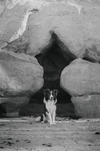 A Border Collie sits in front of a rocky cave entrance, exuding calmness and strength.