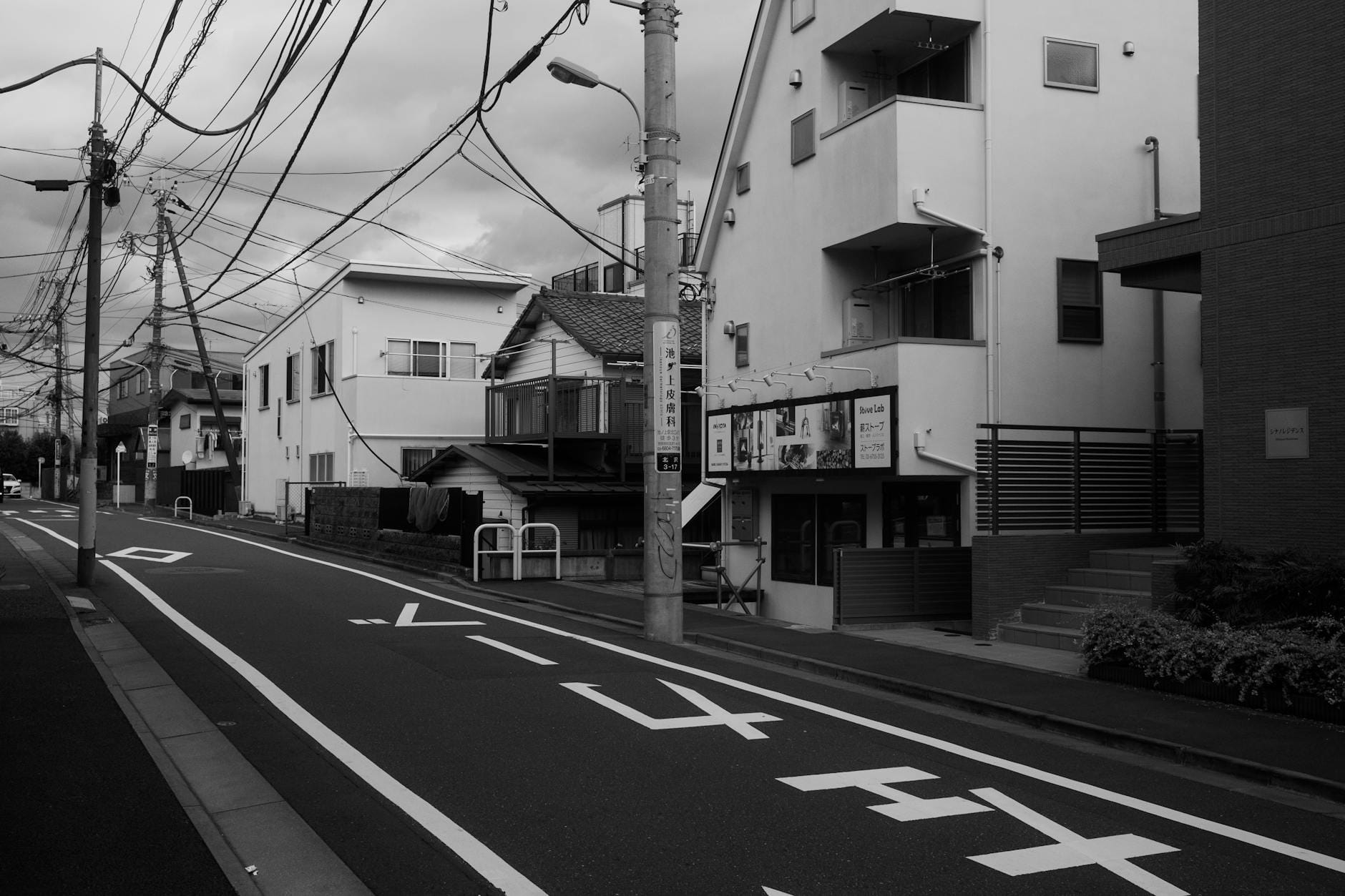 Black and white photo of urban rooftops through a window, creating a framed cityscape.