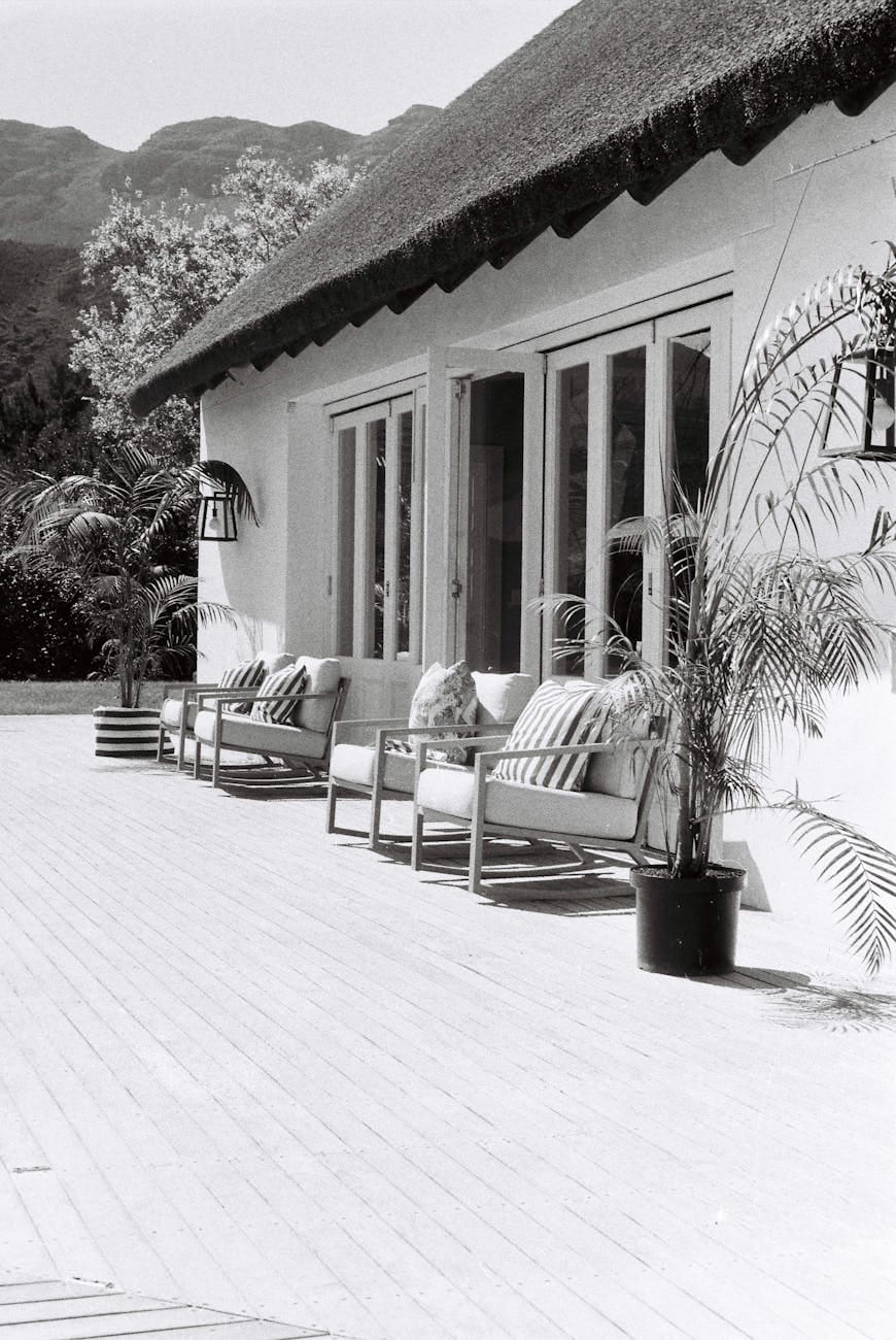 Serene sunset view from a tropical resort, featuring poolside lounge chairs and fringed umbrellas.