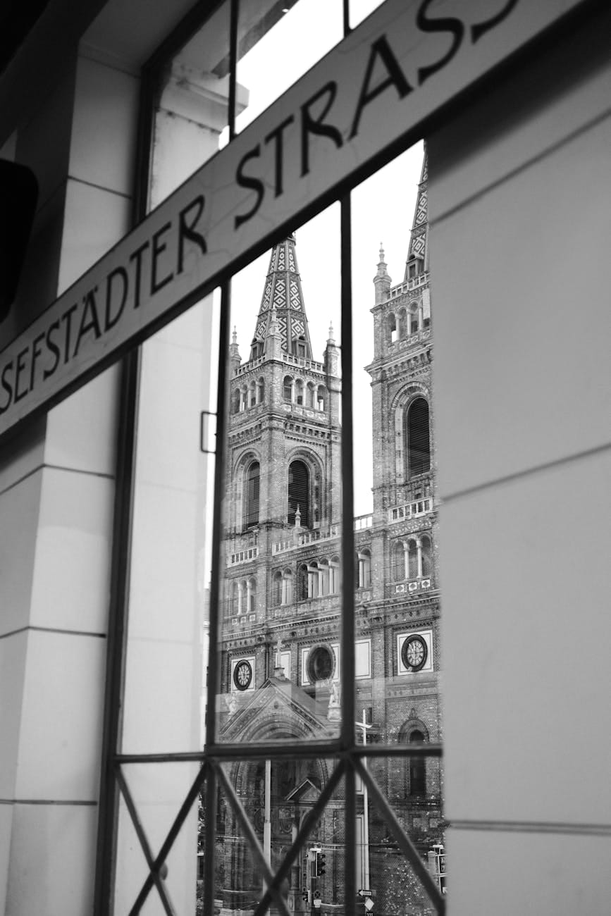 Elegant old building facade with sunlight filtering through autumn leaves, creating a warm, nostalgic atmosphere.