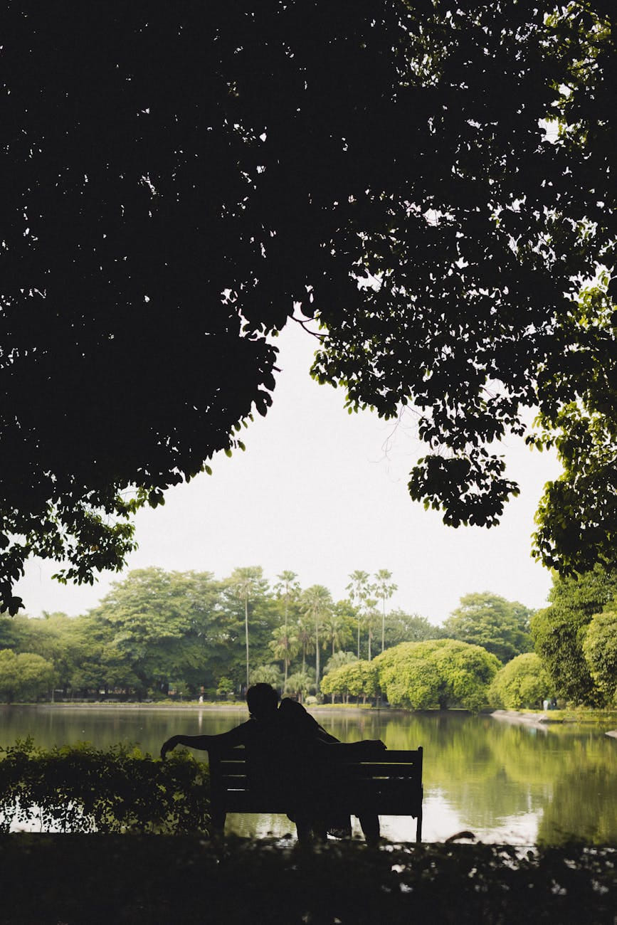 personoutdoorsnaturesceneryadultmalemanbenchsittingpond