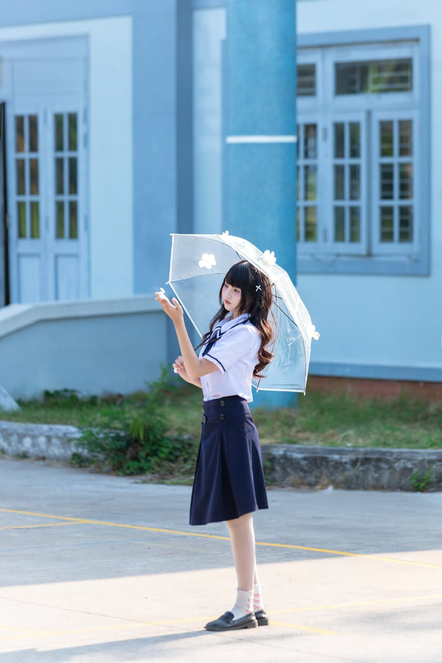 A young woman in school uniform holding a transparent umbrella outdoors, showcasing fashion and casual style.