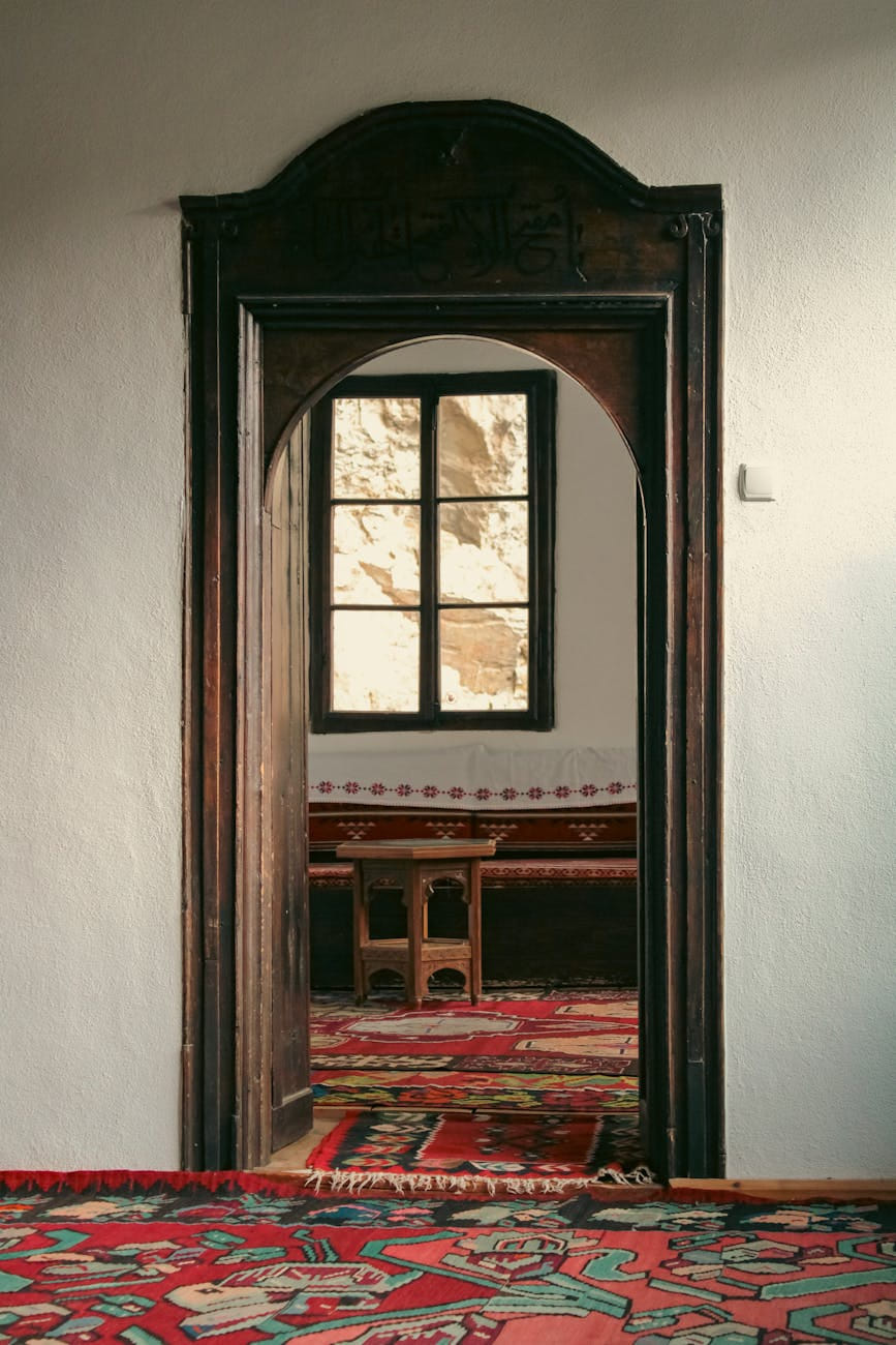 Elegant old building facade with sunlight filtering through autumn leaves, creating a warm, nostalgic atmosphere.
