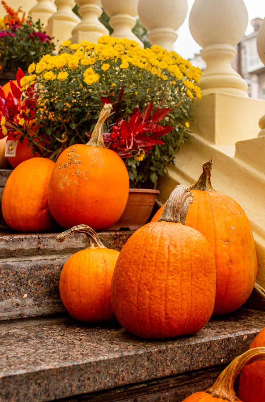 Warm autumn-themed tea setup with sunflowers and pumpkins, ideal for fall vibes.