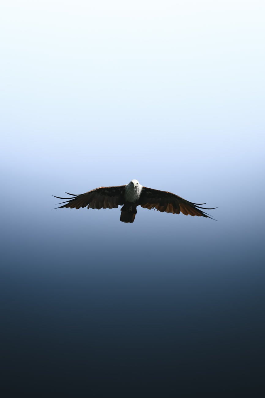 A silhouette of a seagull flying over the ocean at sunset against a vibrant sky.