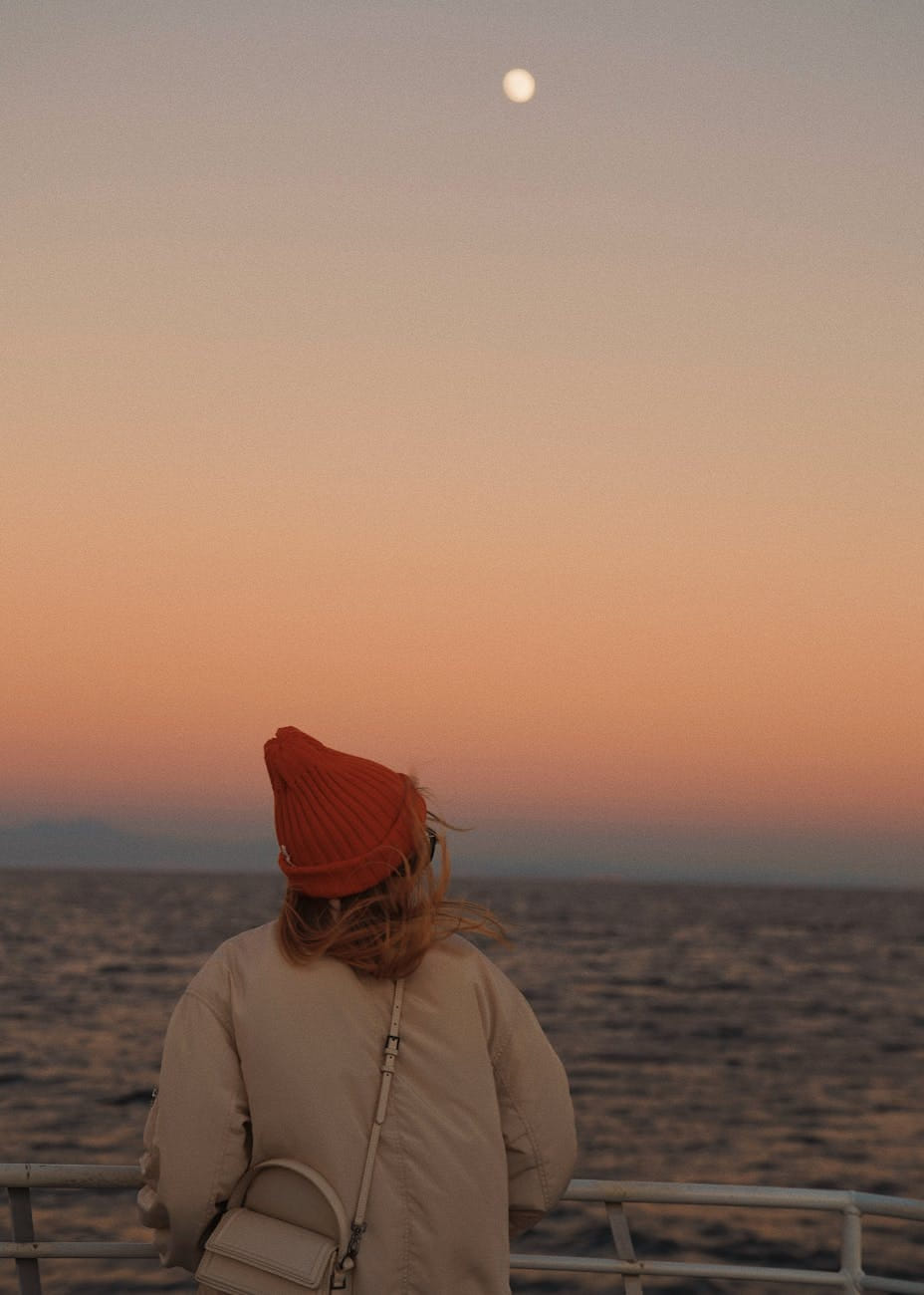 Silhouette of camels and person walking across a sandy desert dune at sunrise.