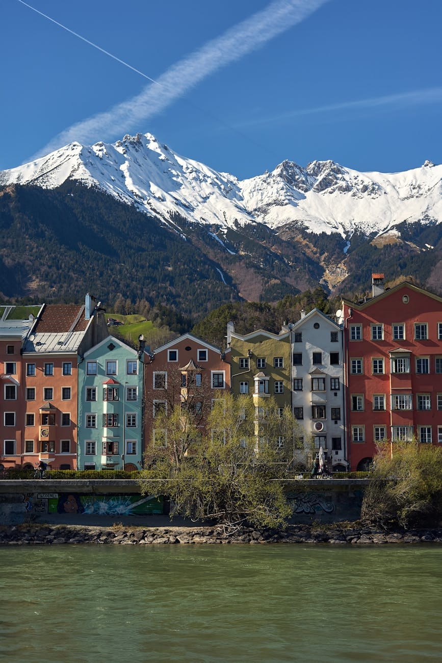 Picturesque view of Seeschloss Ort castle on Traunsee Lake with mountains in the background during twilight.