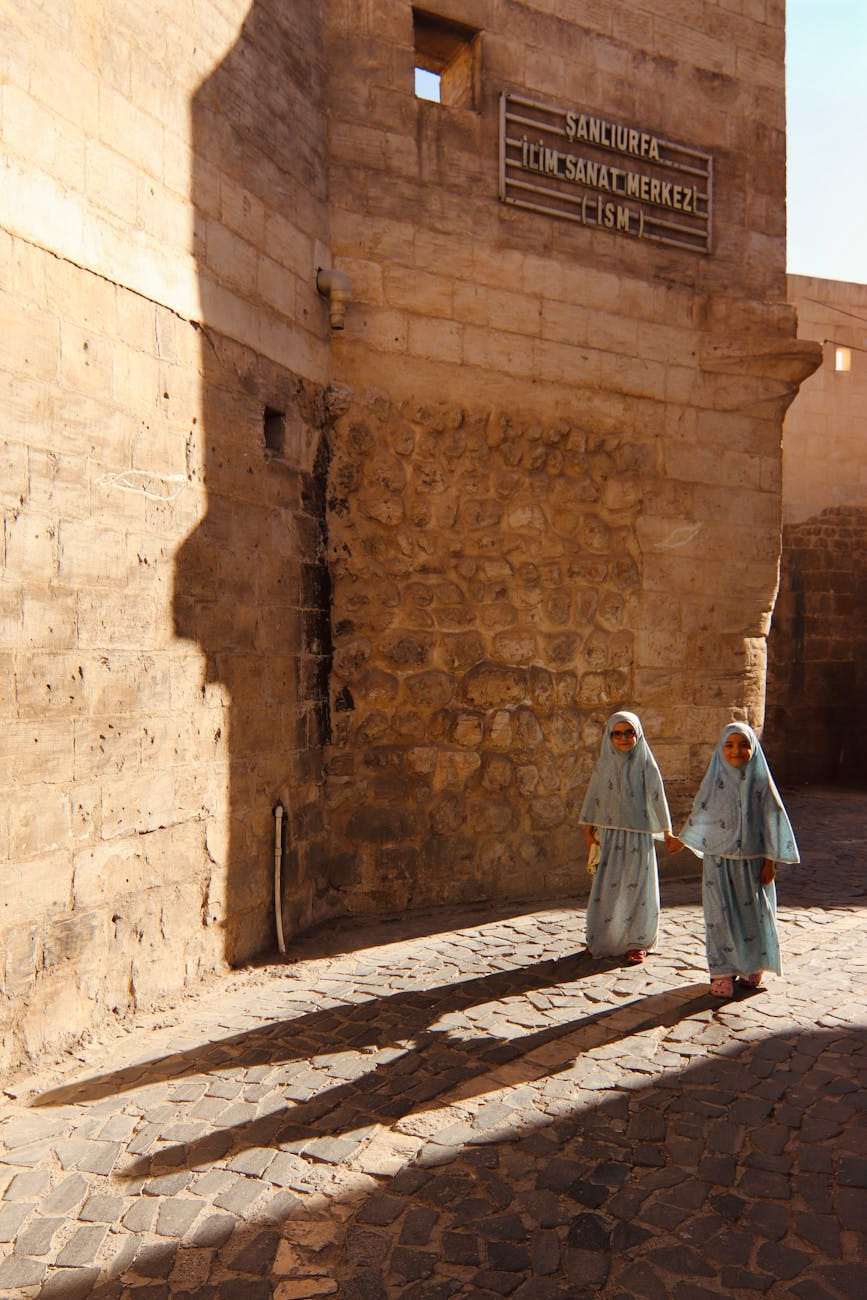 Two children in traditional clothing walk along historic streets in Şanlıurfa, Türkiye.