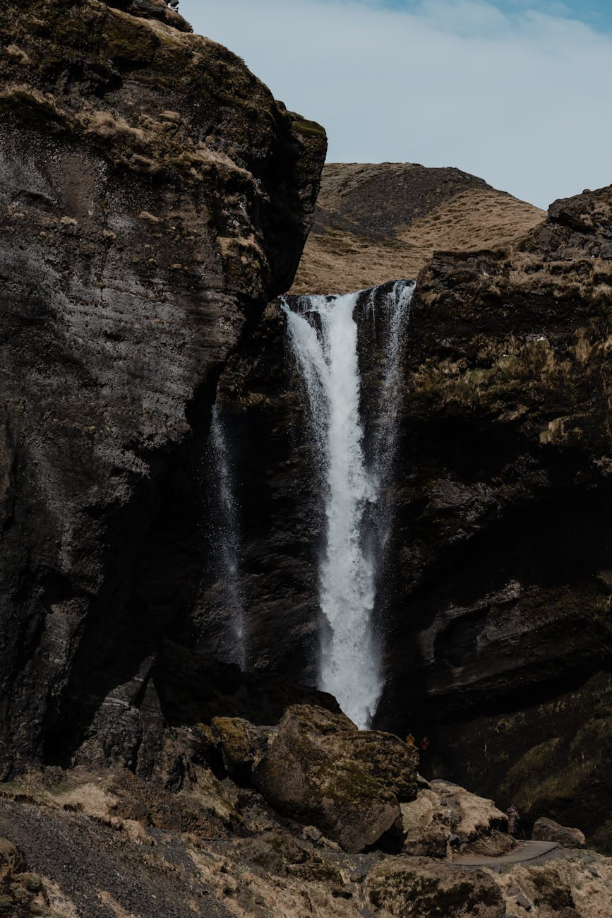 Stunning waterfall cascading down a rocky canyon, showcasing natural beauty and grandeur.