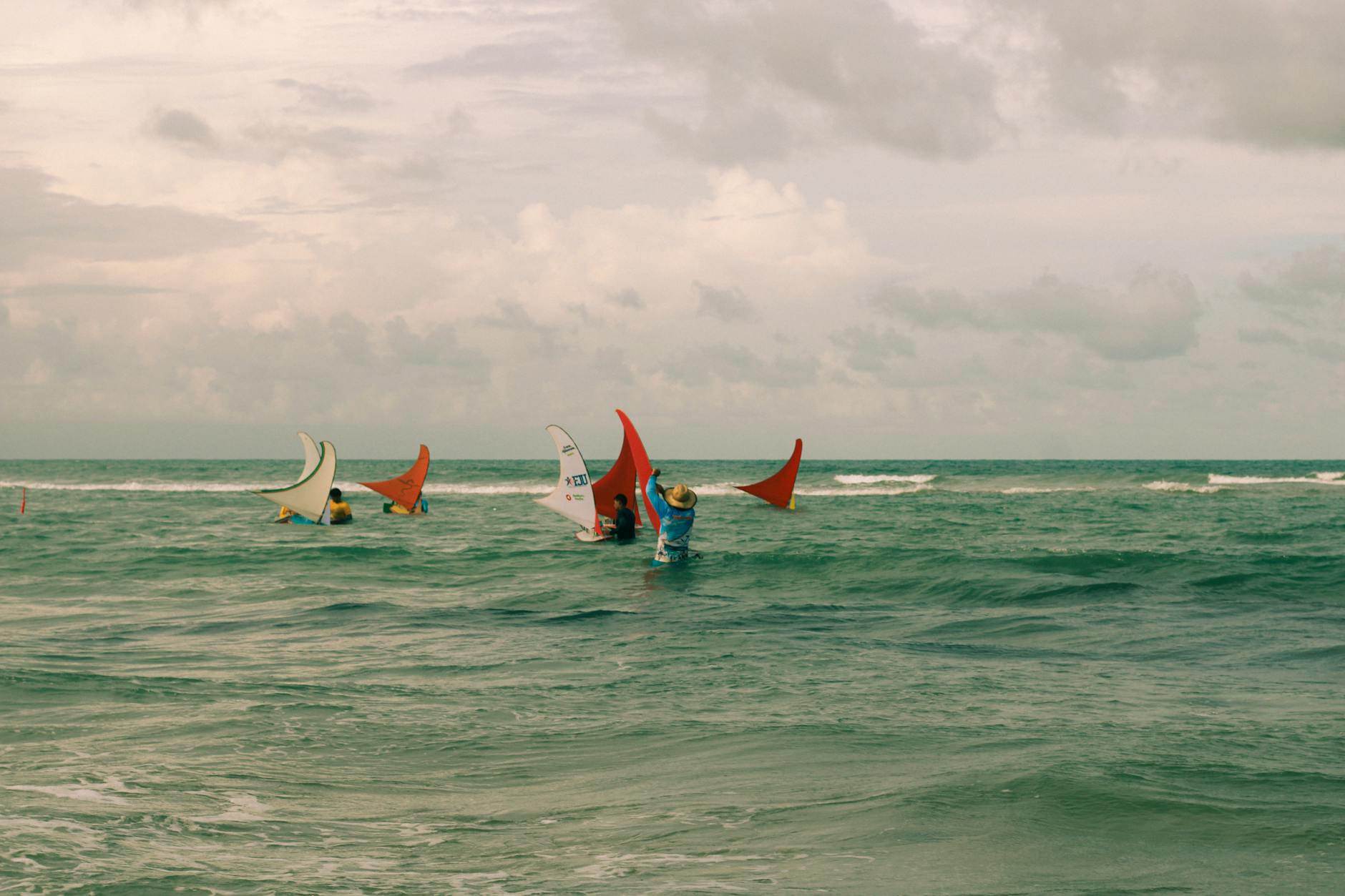 A breathtaking view of rugged cliffs and a serene beach with swimmers enjoying the ocean waves.