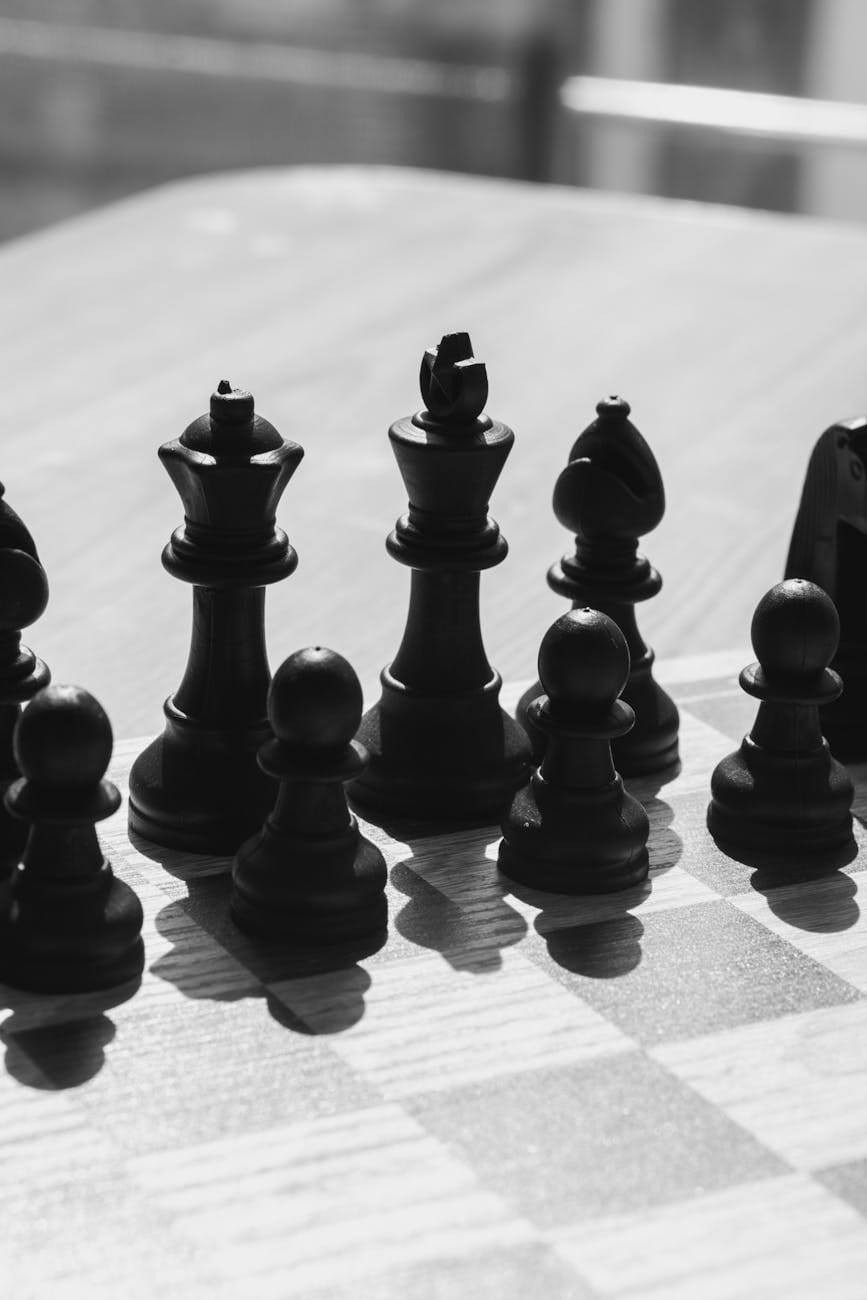 High-contrast black and white photo of a chess game in progress, capturing strategic intensity.