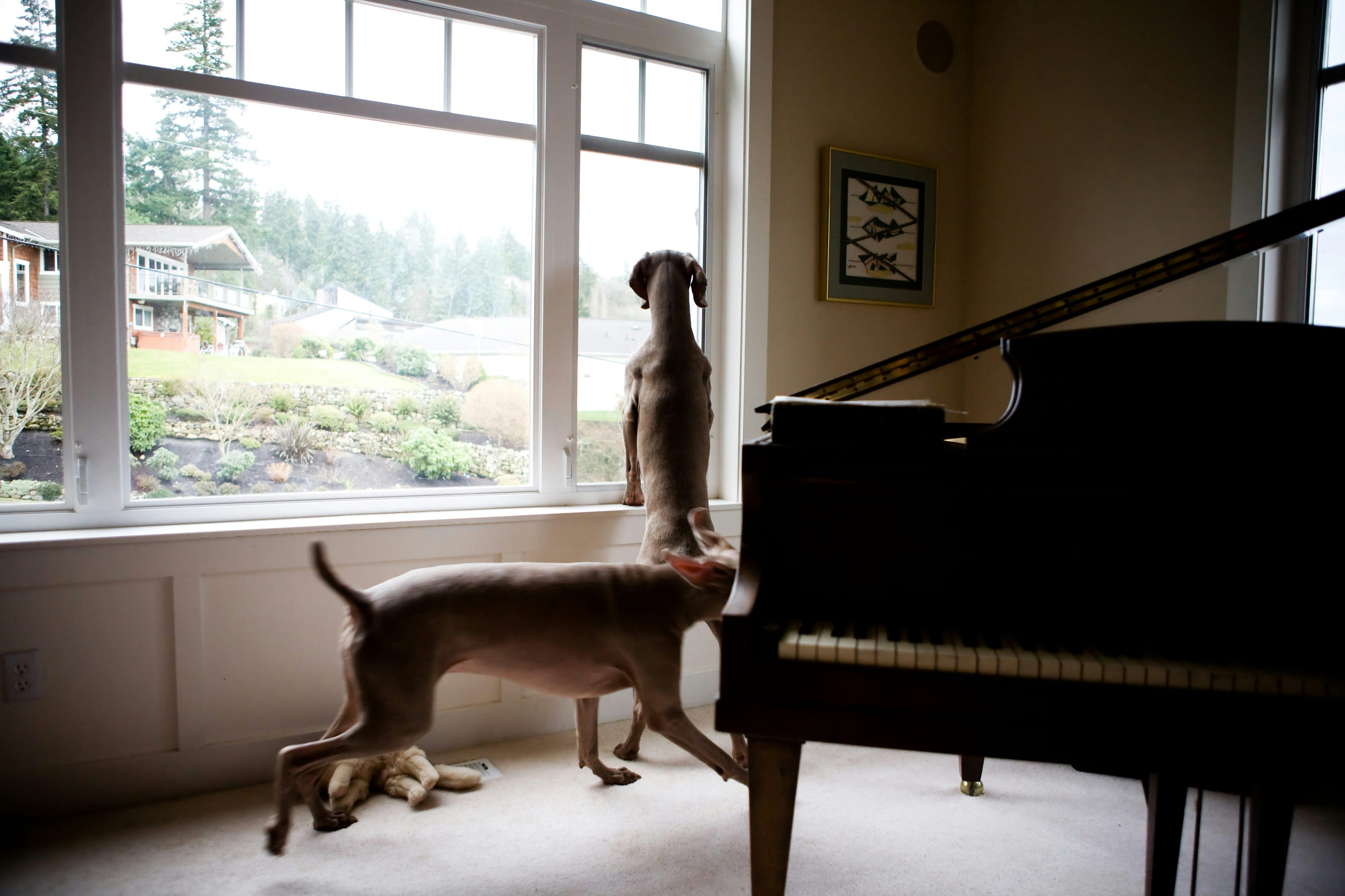 Black and white photo of urban rooftops through a window, creating a framed cityscape.