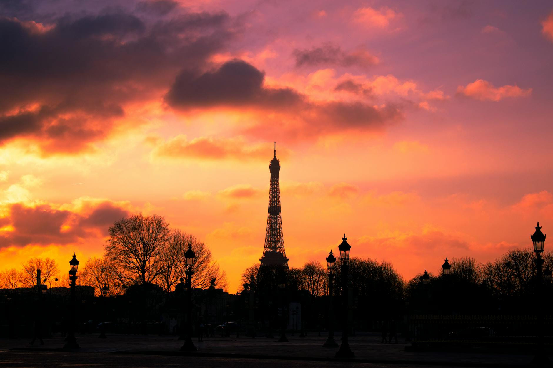 Silhouette of camels and person walking across a sandy desert dune at sunrise.
