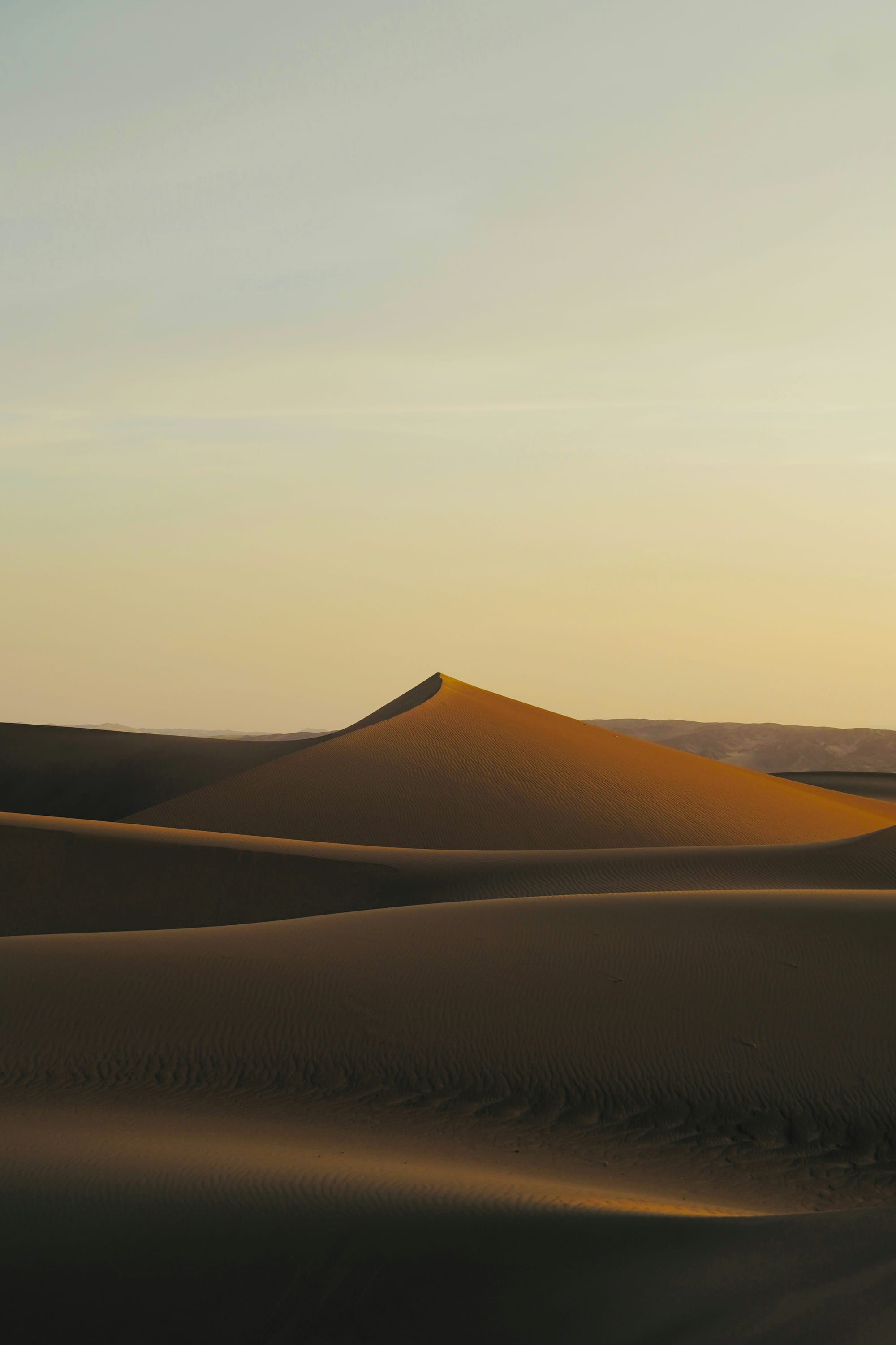 Silhouette of camels and person walking across a sandy desert dune at sunrise.
