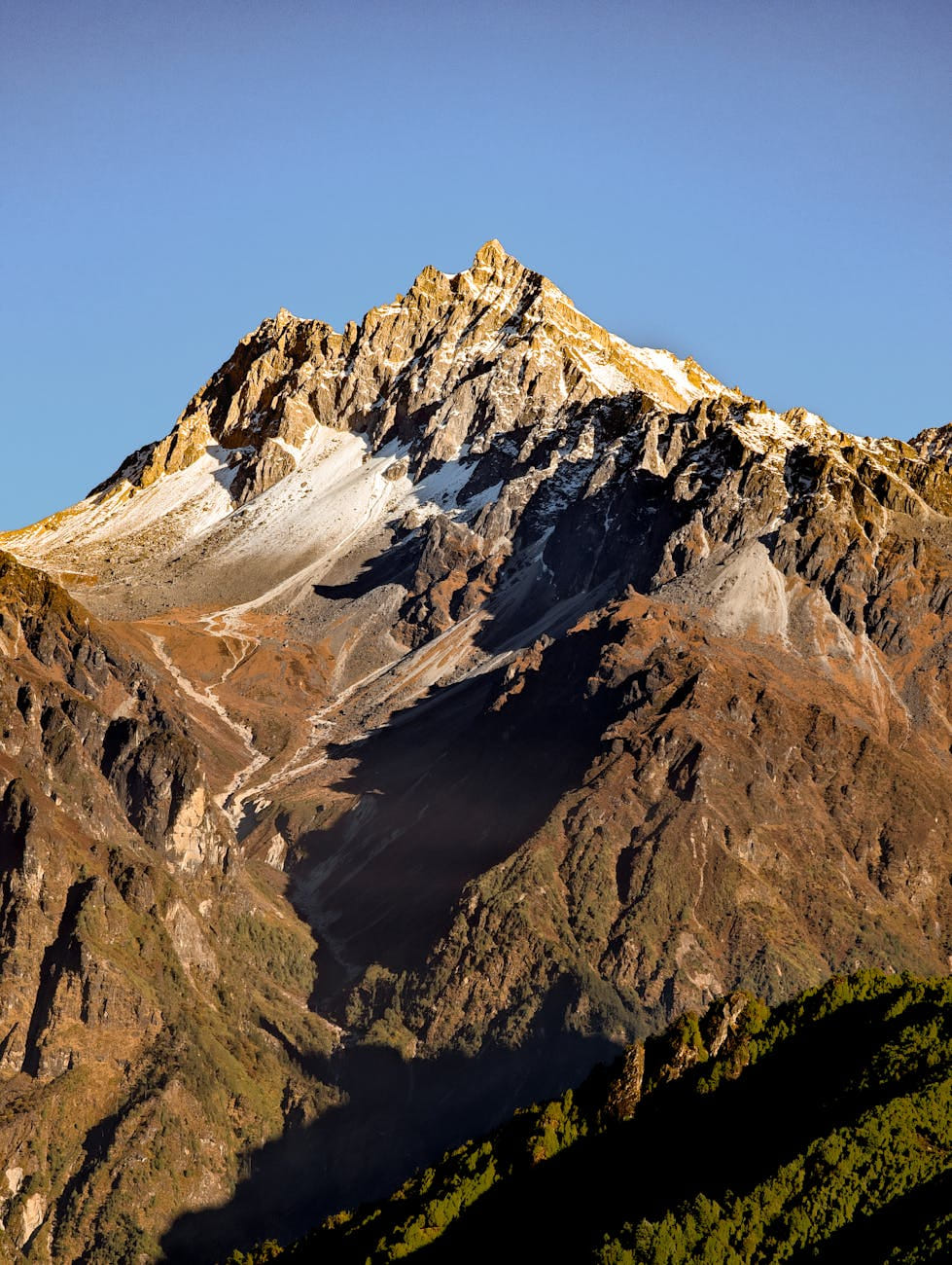 Stunning view of a snow-capped mountain peak in Helambu, Nepal at sunset.