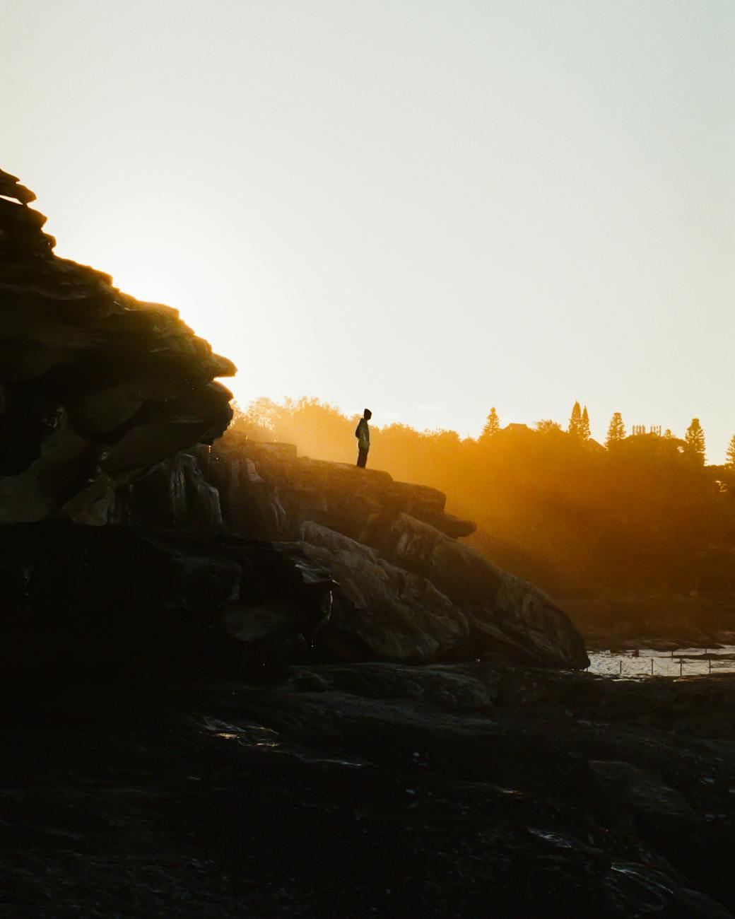 Silhouette of camels and person walking across a sandy desert dune at sunrise.