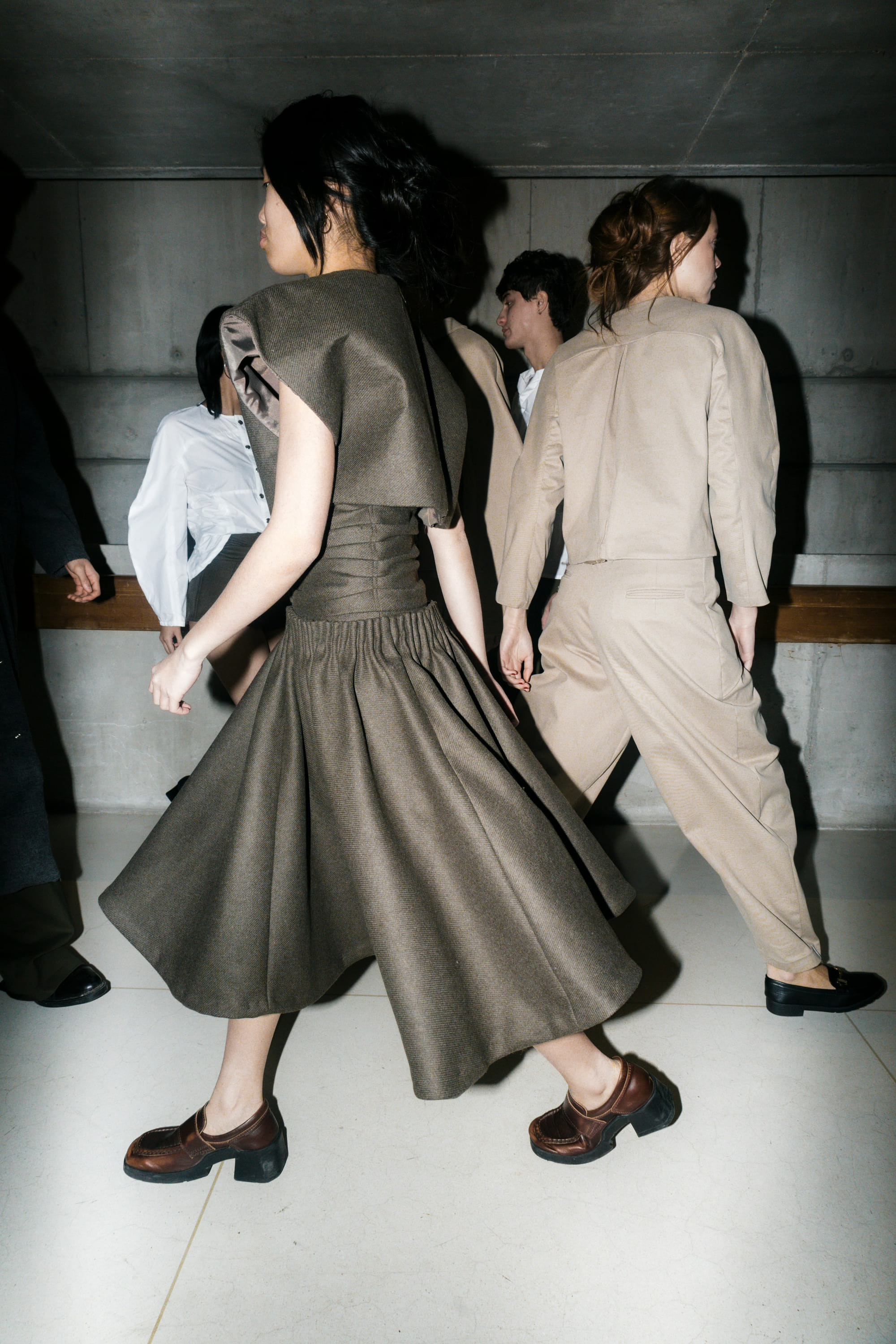 Models walk during a fashion show backstage.