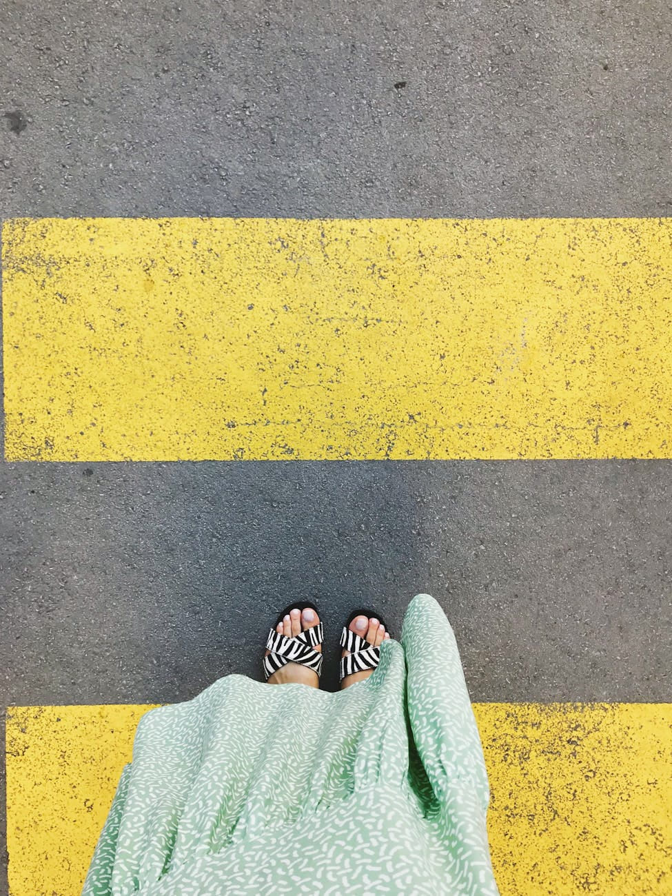 A person walks outdoors reflected in a modern glass facade, creating unique shadows.