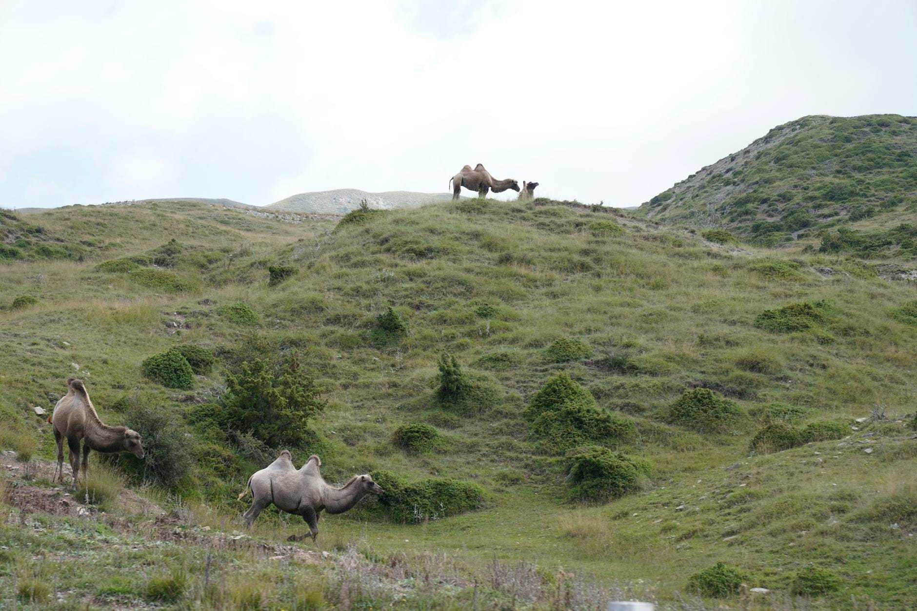 Silhouette of camels and person walking across a sandy desert dune at sunrise.