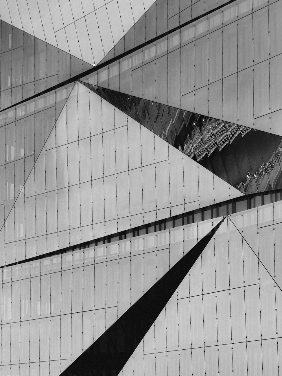 Artistic blur of skyscrapers reflecting on water, creating an abstract cityscape.