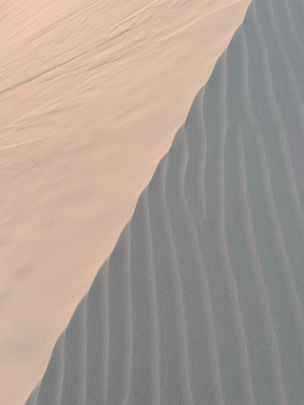 Silhouette of camels and person walking across a sandy desert dune at sunrise.
