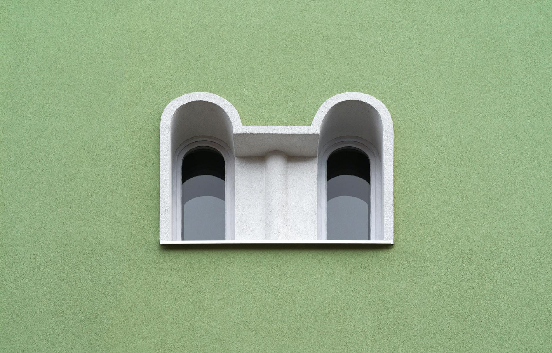 Elegant old building facade with sunlight filtering through autumn leaves, creating a warm, nostalgic atmosphere.