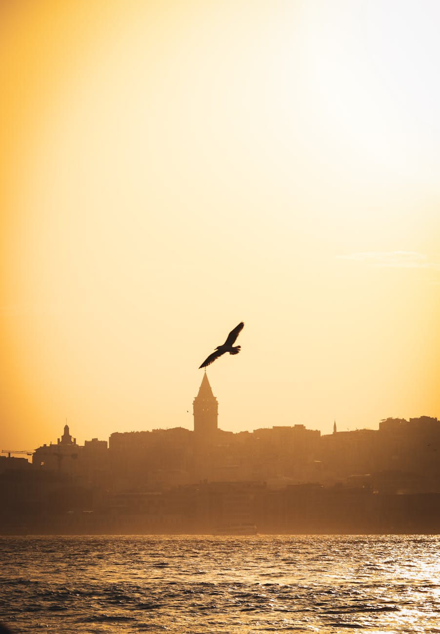 View of the historic Galata Tower surrounded by urban Istanbul architecture. Iconic cityscape.
