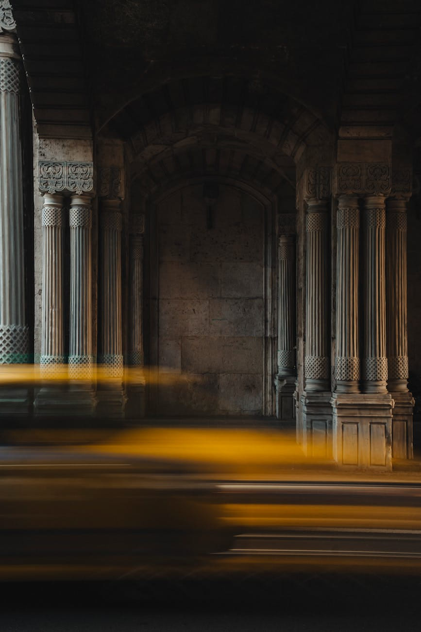 Elegant old building facade with sunlight filtering through autumn leaves, creating a warm, nostalgic atmosphere.