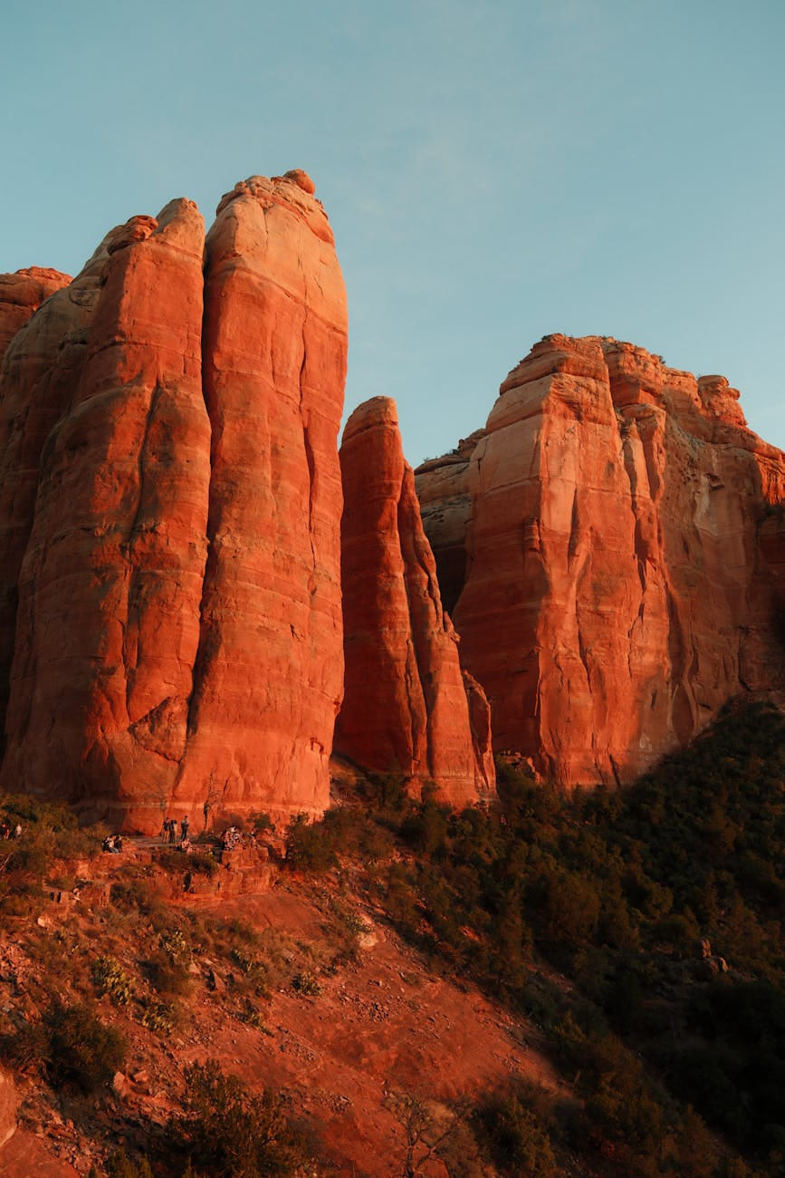 Silhouette of camels and person walking across a sandy desert dune at sunrise.