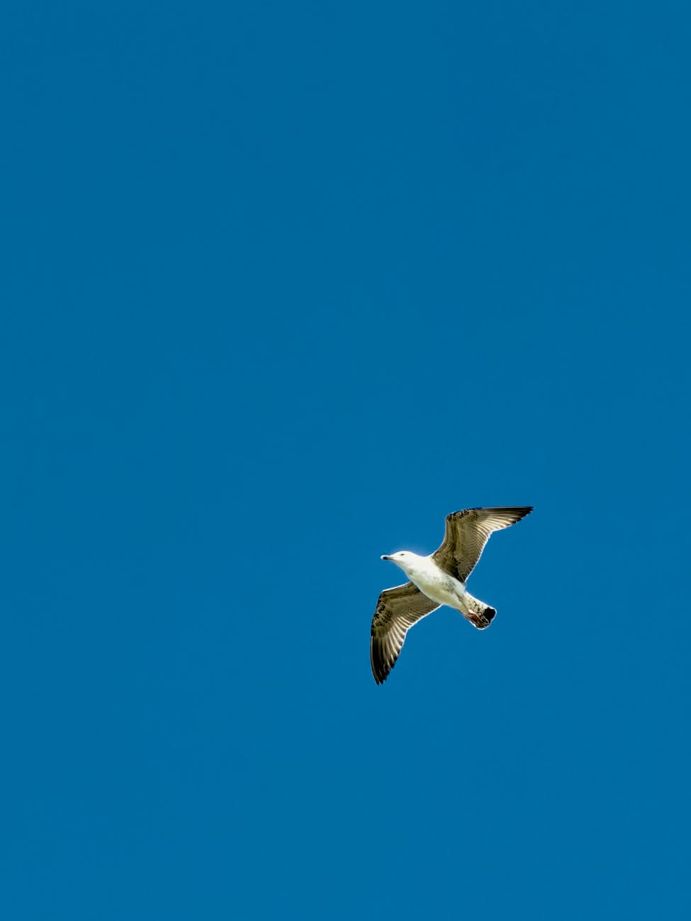 A silhouette of a seagull flying over the ocean at sunset against a vibrant sky.