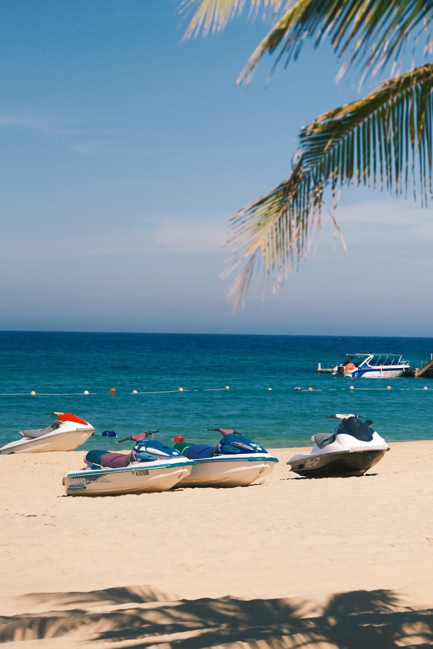 A breathtaking view of rugged cliffs and a serene beach with swimmers enjoying the ocean waves.