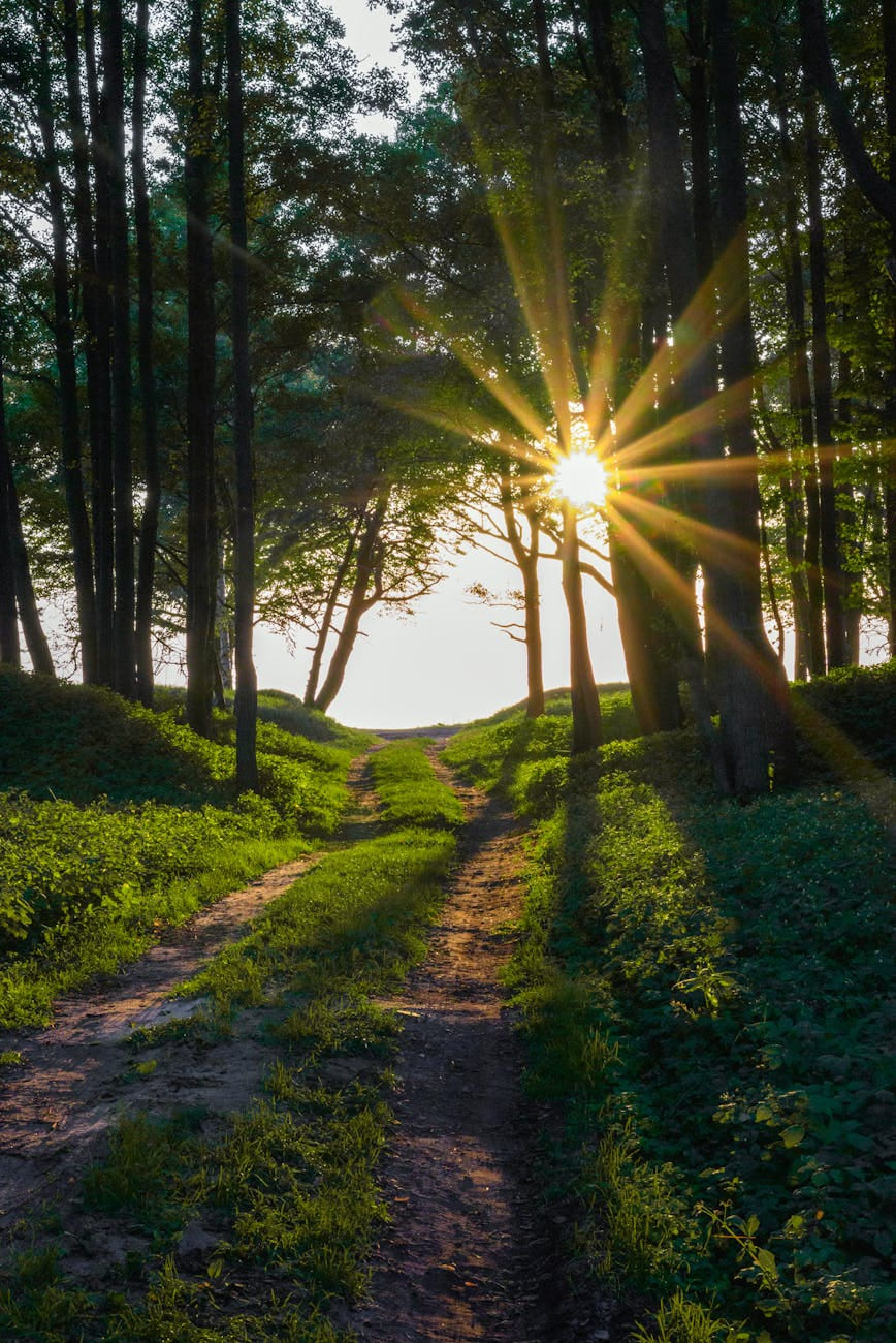 Silhouette of camels and person walking across a sandy desert dune at sunrise.