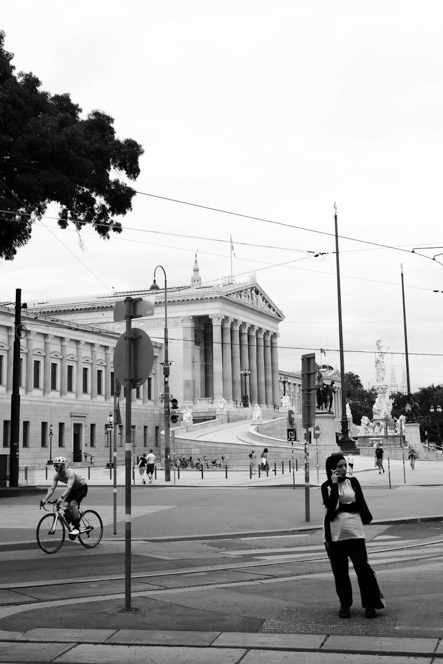 Black and white photo of a classical building with people and cyclist in an urban setting.