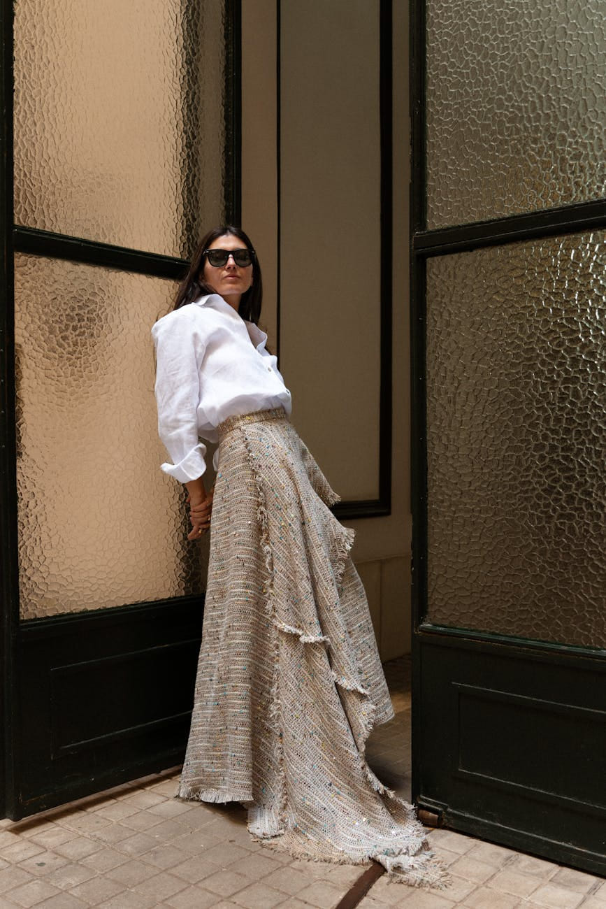 Stylish woman in long skirt and blouse standing by vintage doors.