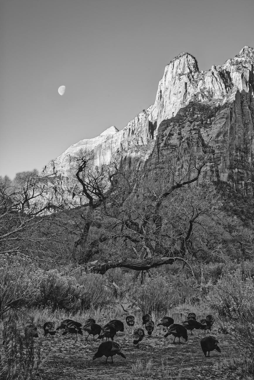 Wild turkeys and moon in Zion's rocky landscape, Utah.