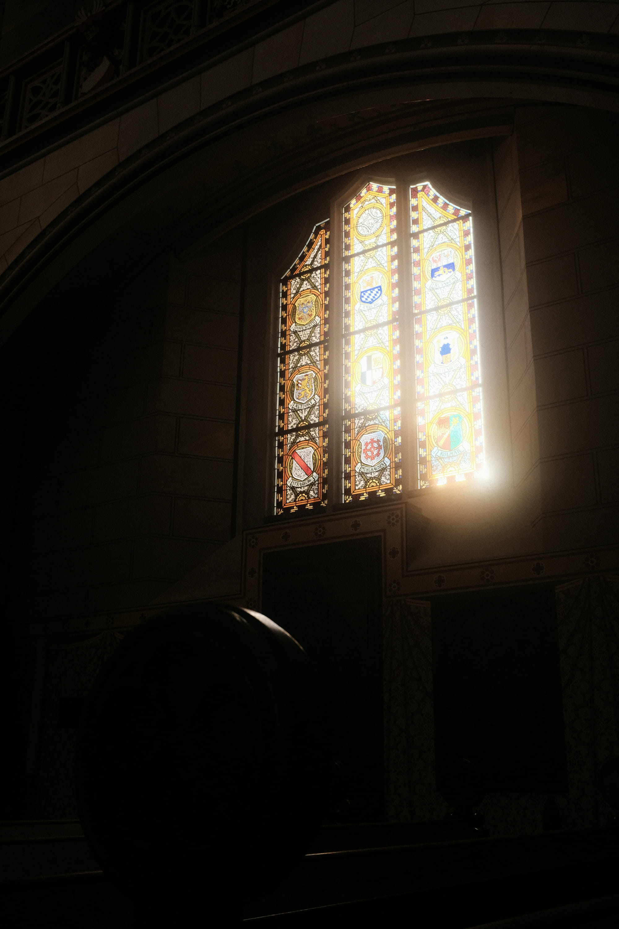 Elegant old building facade with sunlight filtering through autumn leaves, creating a warm, nostalgic atmosphere.
