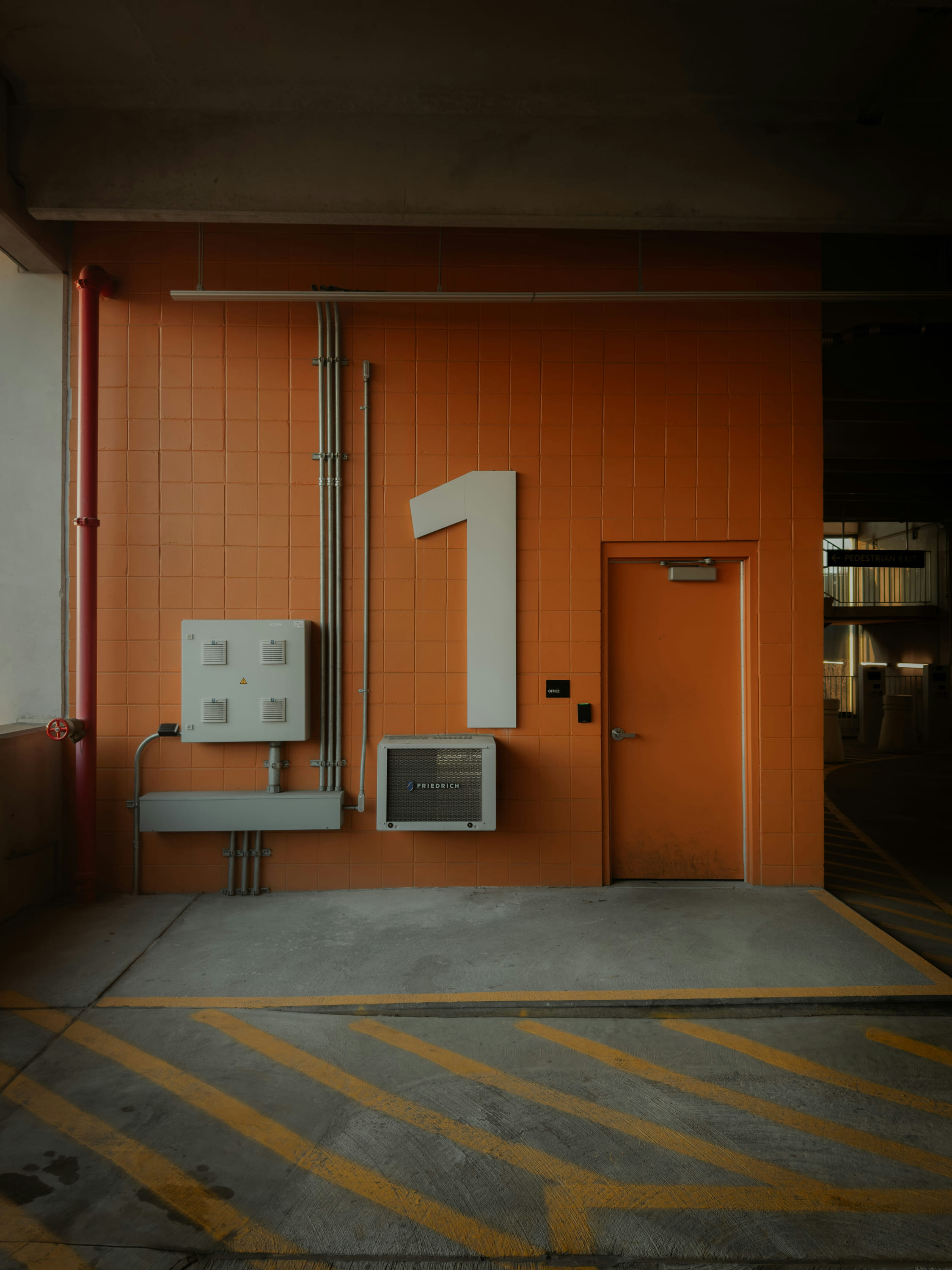 A sleek minimalist red facade with a large garage door, perfect for industrial themes.