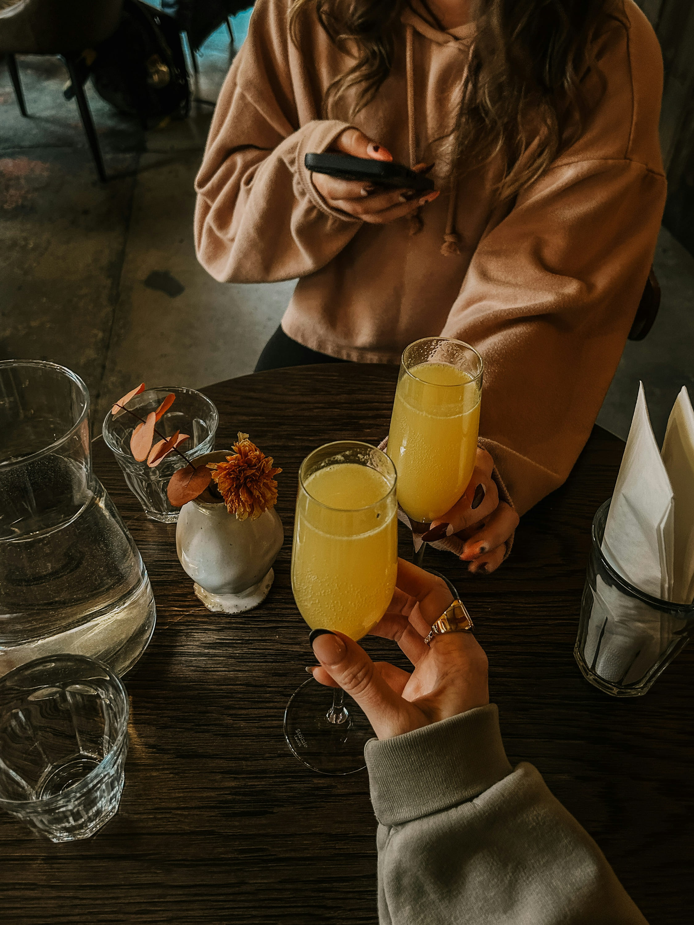 Warm autumn setting with pumpkin mugs, candle, and fall leaves on a cozy table.