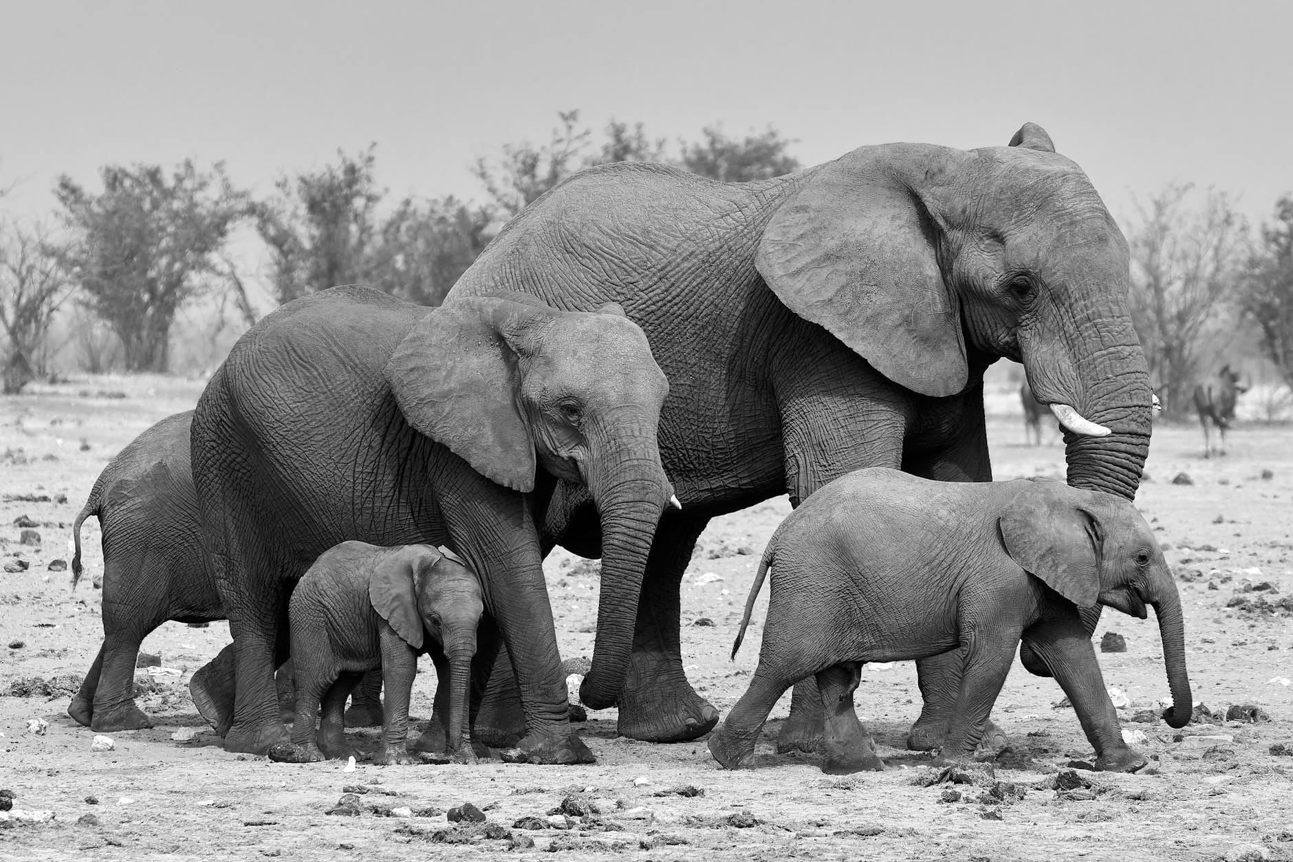 Silhouette of camels and person walking across a sandy desert dune at sunrise.
