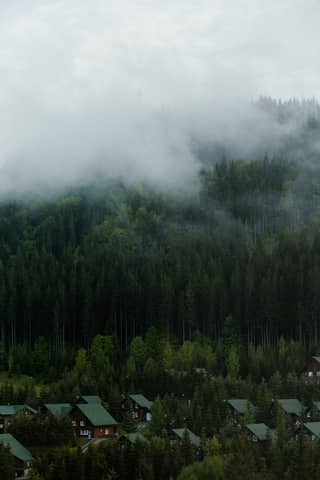 Foggy Carpathian landscape with lush forest and cozy cabins in Bukovel.