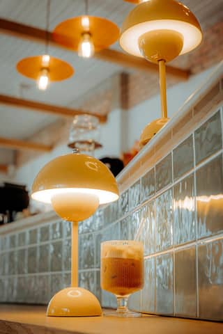 A cinnamon roll and refreshing drink served on a wooden table in Hue, Vietnam, outdoors.