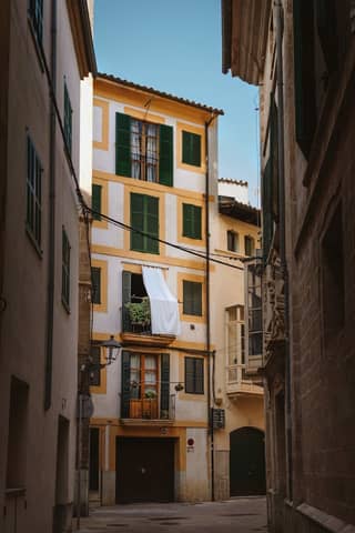Picturesque alleyway in Palma, Mallorca showcasing traditional Mediterranean architecture.