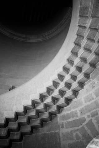 Black and white photo of a spiral stone staircase featuring geometric design in Pierrefonds, France.
