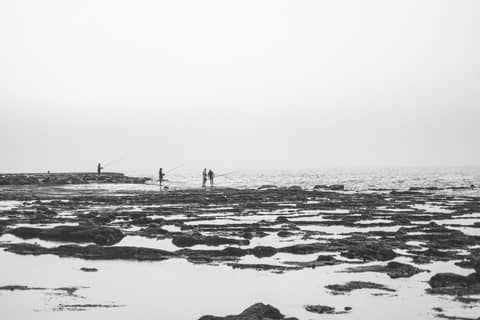 Serene black and white scene of a man fishing by the misty riverside in France.