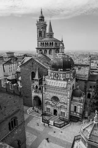 Black and white aerial view of Santa Maria Maggiore Basilica in Bergamo, Italy.
