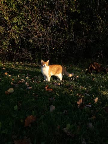 An orange and white cat stands in a sunlit field with autumn leaves scattered around.