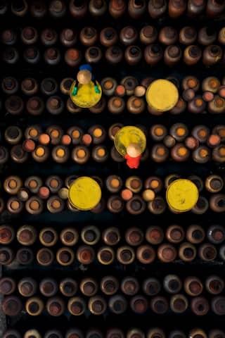 Children playing soccer on an outdoor field, aerial view.