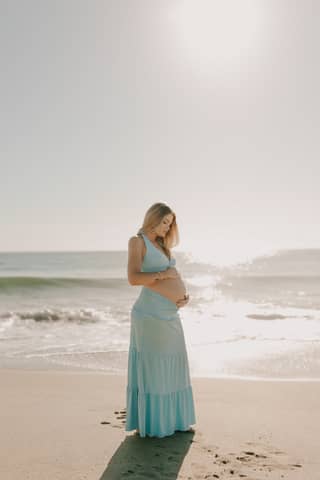 A stylish woman in a white dress sits on a yellow jeep, enjoying a sunny coastal day.