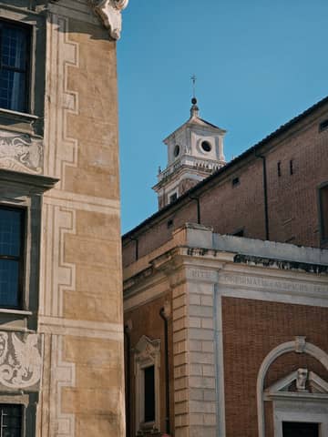 A church steeple with a palm tree in the foreground